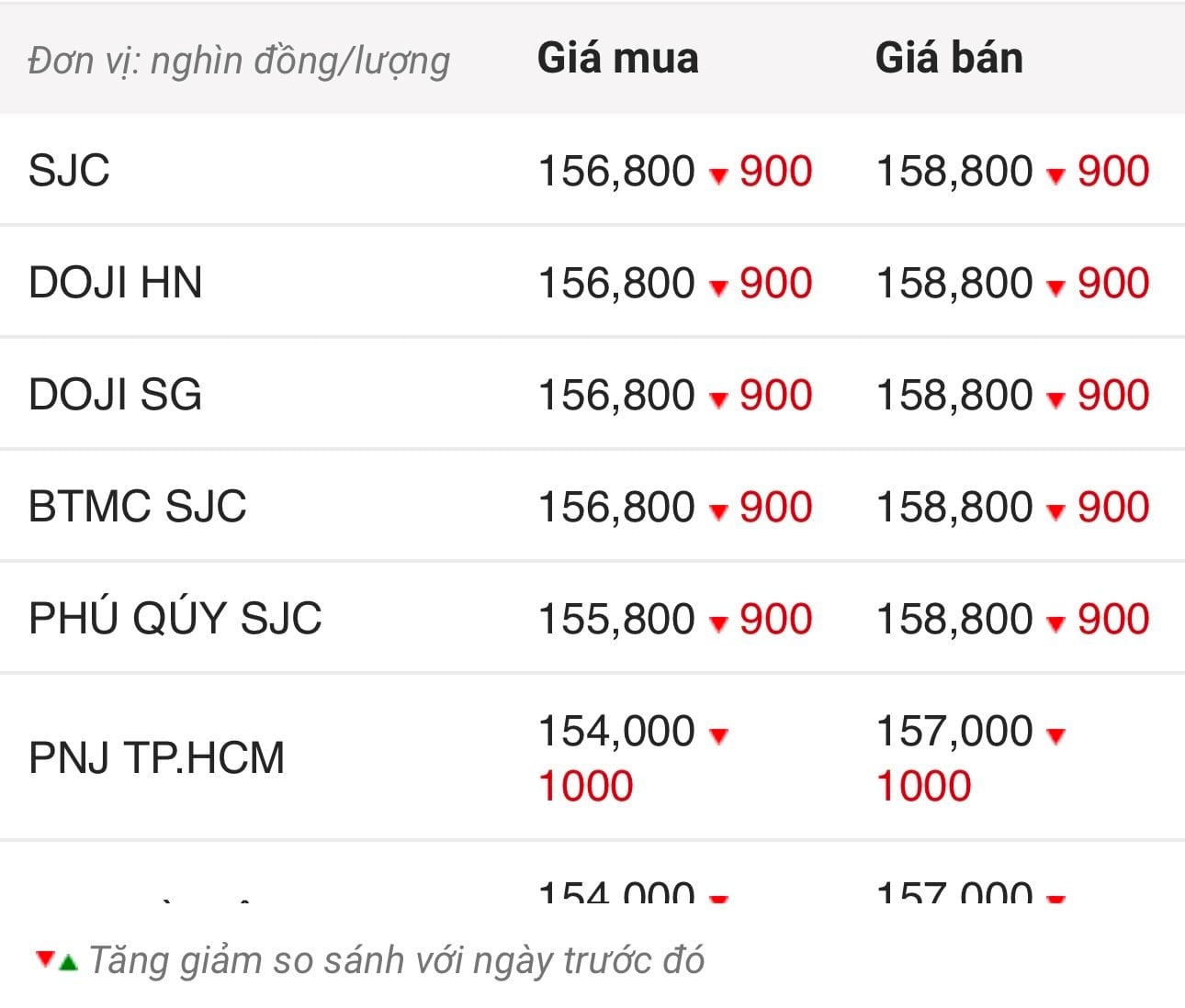 margin: 15px auto;" />Công ty Vàng bạc đá quý Sài Gòn (SJC), Tập đoàn Vàng bạc Đá quý DOJI và Bảo Tín Minh Châu cùng niêm yết giá vàng miếng SJC mua vào-bán ra ở mức 156,8-158,8 triệu đồng/lượng, giảm 900.000 đồng ở cả chiều mua và chiều bán ra so với chốt phiên trước.