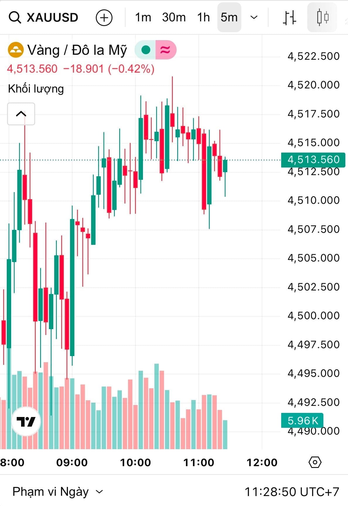 Thời điểm 10h50' theo giờ Việt Nam, giá vàng thế giới giao ngay ở mức 4.513 USD/ounce, giảm 6 USD/ounce so với với đầu phiên sáng. Hiện, giá vàng thế giới quy đổi theo tỷ giá niêm yết tại Vietcombank vào khoảng 143,5 triệu đồng/lượng.