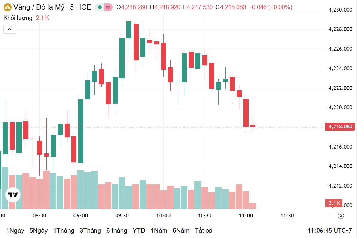 Trên thị trường quốc tế, lúc 10h50 theo giờ Việt Nam, giá vàng thế giới giao ngay ở mức 4.218 USD/ounce, giảm 23 USD/ounce so với mức đóng cửa phiên trước. Hiện, giá vàng thế giới quy đổi theo tỷ giá niêm yết tại Vietcombank vào khoảng 134,33 triệu đồng/lượng.