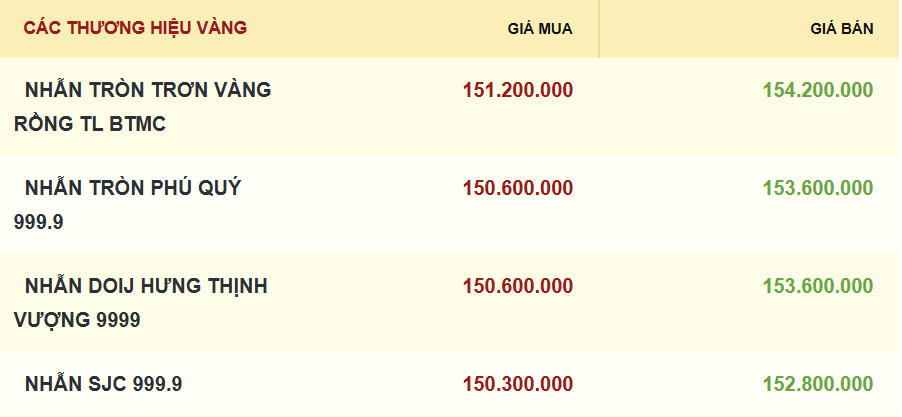 Trong khi đó, giá vàng nhẫn và vàng trang sức 99,99 được các thương hiệu điều chỉnh đi ngang hoặc tăng 200.000 đồng ở cả hai chiều mua và bán so với phiên trước. Trong đó, giá mua-bán vàng nhẫn tròn trơn vàng rồng Bảo Tín Minh Châu hiện ở mức 151,2-154,2 triệu đồng/lượng. Với các thương hiệu còn lại, giá bán ra vàng nhẫn trong khoảng 152,8-153,6 triệu đồng/lượng.