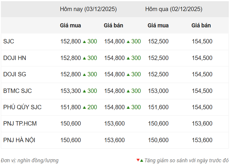 Như vậy, trong 3 ngày qua, giá vàng miếng liên tục biến động khi lập đỉnh 155,7 triệu đồng/lượng vào ngày 1/12 rồi giảm trở lại, nhưng vẫn duy trì ở vùng đỉnh lịch sử. Trong khi đó, giá vàng nhẫn và vàng trang sức 99,99% các loại được giao dịch ổn định trong khoảng 150,3 triệu đồng/lượng mua vào, 152,8 triệu đồng/lượng bán ra.