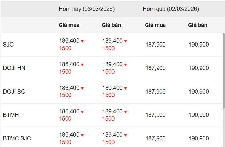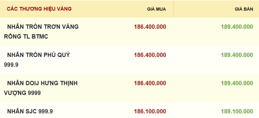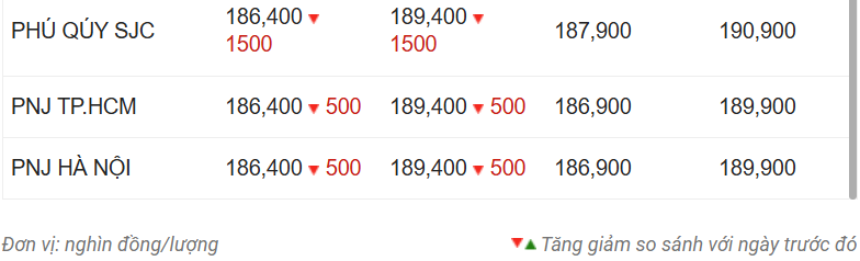 Công ty Vàng bạc đá quý Sài Gòn (SJC), Tập đoàn Vàng bạc Đá quý DOJI, Bảo Tín Minh Châu, Bảo Tín Mạnh Hải và Phú Quý SJC cùng niêm yết giá vàng miếng SJC mua vào-bán ra ở mức 186,4-189,4 triệu đồng/lượng, giảm 1,5 triệu đồng ở cả chiều mua và chiều bán ra so với phiên trước.