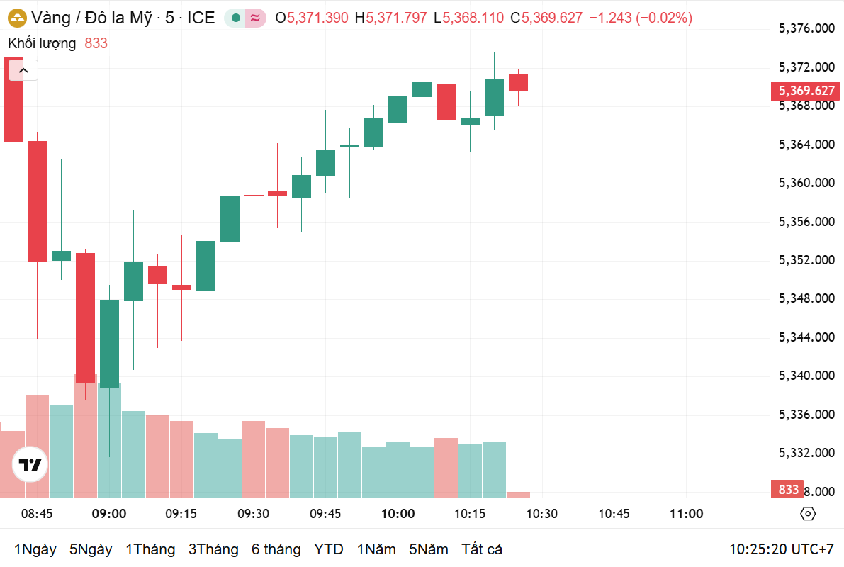 Thời điểm 9h45 sáng nay theo giờ Việt Nam, giá vàng thế giới giao ngay ở mức 5.371 USD/ounce, tăng 1,76% trong 24 giờ qua, tương ứng với tăng 92,76 USD/ounce. Hiện, giá vàng thế giới quy đổi sang tiền Việt Nam đồng khoảng 170,3 triệu đồng/lượng.