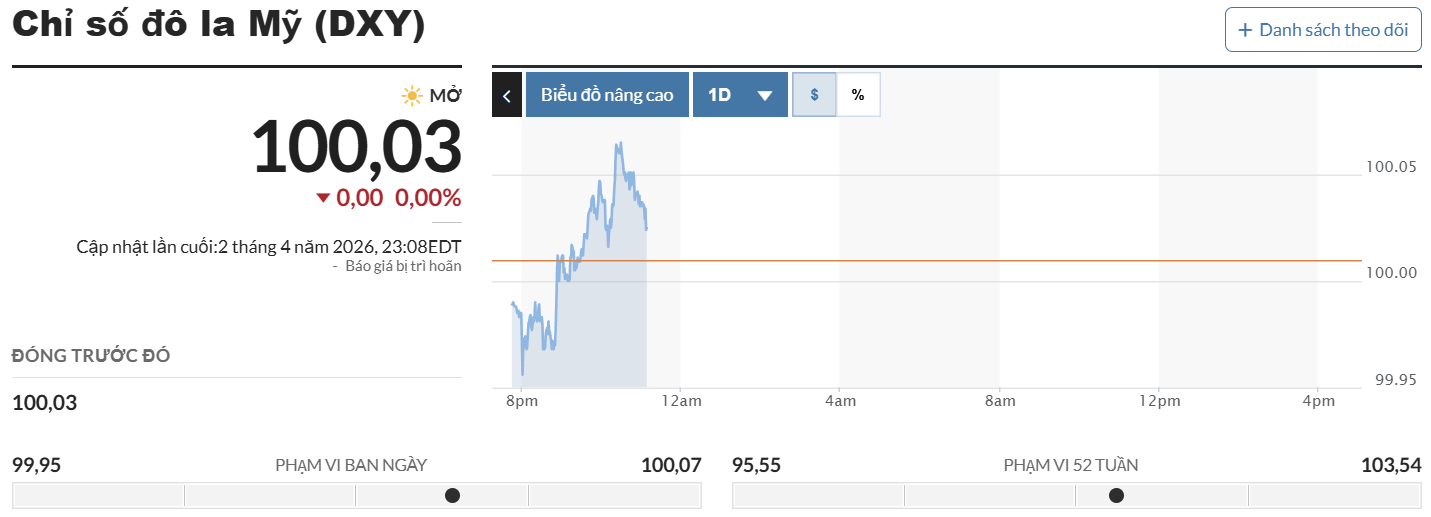 Thời điểm 10h15 (ngày 3/4, giờ Việt Nam), trên thị trường thế giới, chỉ số USD Index (DXY) - thước đo sức mạnh của đồng bạc xanh ở mức 100,03 điểm, giữ nguyên so với phiên trước đó.