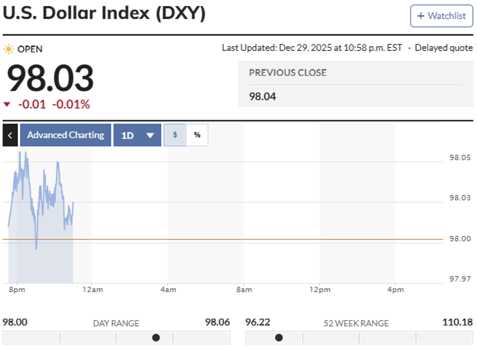 Trong khi đó, chỉ số Dollar Index (DXY) - đo lường sức mạnh của đồng USD so với rổ 6 đồng tiền chủ chốt (EUR, JPY, GBP, CAD, SEK, CHF) mở cửa phiên giao dịch ngày 30/12 ở mức 98,01 điểm, giảm 0,03 điểm so với phiên trước đó. Đến 11 giờ 00 phút hôm nay, chỉ số DXY ghi nhận giảm 0,02 điểm, xuống mức 98,02 điểm.