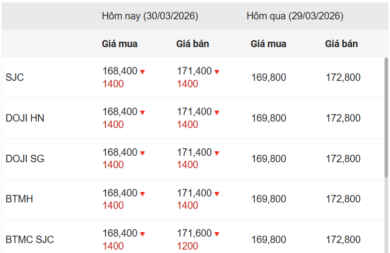 (Banker.vn) Trong phiên giao dịch sáng ngày 30/3, giá vàng trong nước được các thương hiệu điều chỉnh giảm sâu, với giá mua - bán vàng miếng SJC và vàng nhẫn đồng loạt ở mức 168,4 - 171,4 triệu đồng/lượng.