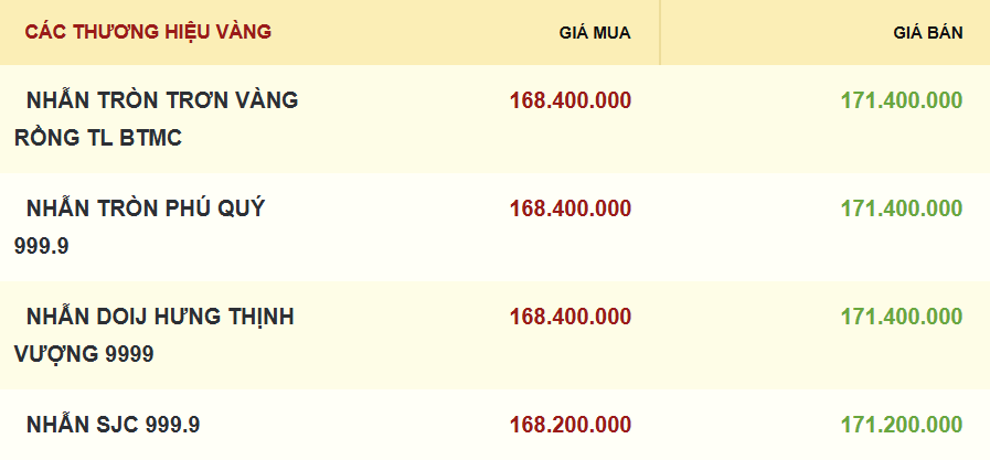 Cùng xu hướng, giá vàng nhẫn và vàng trang sức hôm nay cũng được các thương hiệu điều chỉnh giảm 1,2 - 1,4 triệu đồng/lượng ở cả hai chiều mua vào và bán ra. Cụ thể, giá mua - bán vàng nhẫn tròn trơn được Bảo Tín Minh Châu, DOJI và Phú Quý niêm yết ở mức 168,4 - 171,4 triệu đồng/lượng, tương đương giá vàng miếng; vàng nhẫn SJC niêm yết ở mức 168,2 - 171,2 triệu đồng/lượng.
