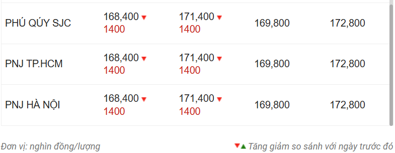 Công ty Vàng bạc đá quý Sài Gòn (SJC), DOJI, Bảo Tín Minh Châu, Bảo Tín Mạnh Hải, Phú Quý SJC và PNJ đồng loạt niêm yết giá vàng miếng SJC mua vào-bán ra ở mức 168,4-171,4 triệu đồng/lượng, giảm từ 1,4 triệu đồng/lượng ở cả chiều mua và chiều bán ra so với chốt phiên hôm qua (ngày 27/3).