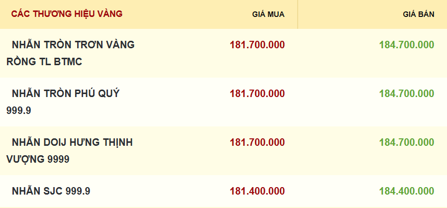 Tương tự giá vàng miếng SJC, vàng nhẫn tròn 9999 cũng đi ngang so với chốt phiên hôm qua, ở mức 181,7 – 184,7 triệu đồng/lượng.