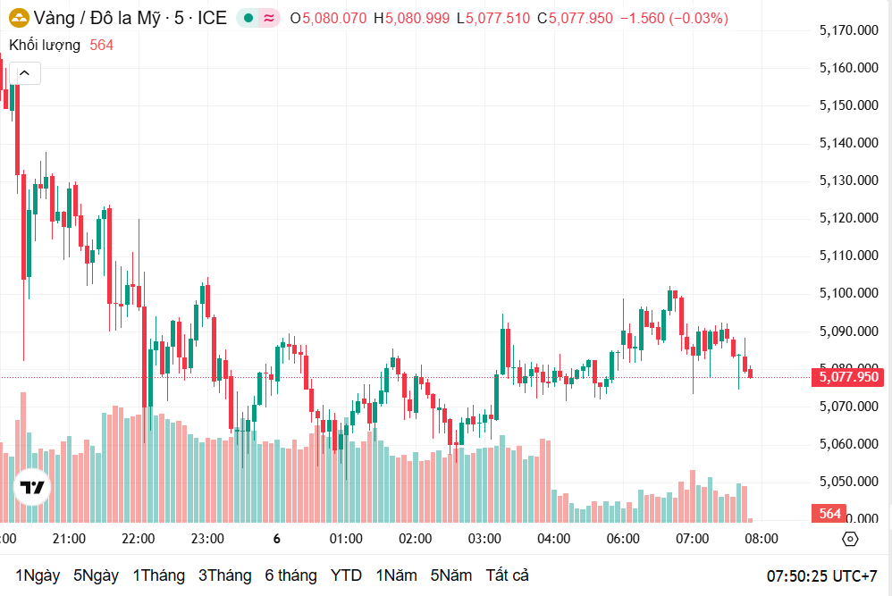 Thời điểm 8h08 hôm nay theo giờ Việt Nam, giá vàng thế giới giao ngay ở mức 5.007 USD/ounce, giảm 0,84% trong 24 giờ qua, tương ứng với giảm 43,18 USD/ounce. Hiện, giá vàng thế giới quy đổi sang tiền Việt Nam đồng khoảng 161,1 triệu đồng/lượng.
