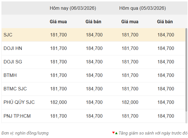 Riêng Phú Quý SJC niêm yết giá vàng miếng SJC mua vào - bán ra ở mức 182 - 184,7 triệu đồng/lượng, không đổi so với chốt phiên ngày 6/3.