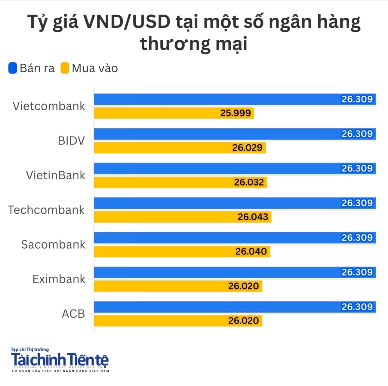 margin: 15px auto;" />Hiện, giá mua thấp nhất ở mức 25.999 VND/USD, giá mua cao nhất ở mức 26.043 VND/USD. Giá bán được các ngân hàng niêm yết đồng loạt ở mức 26.309 VND/USD.