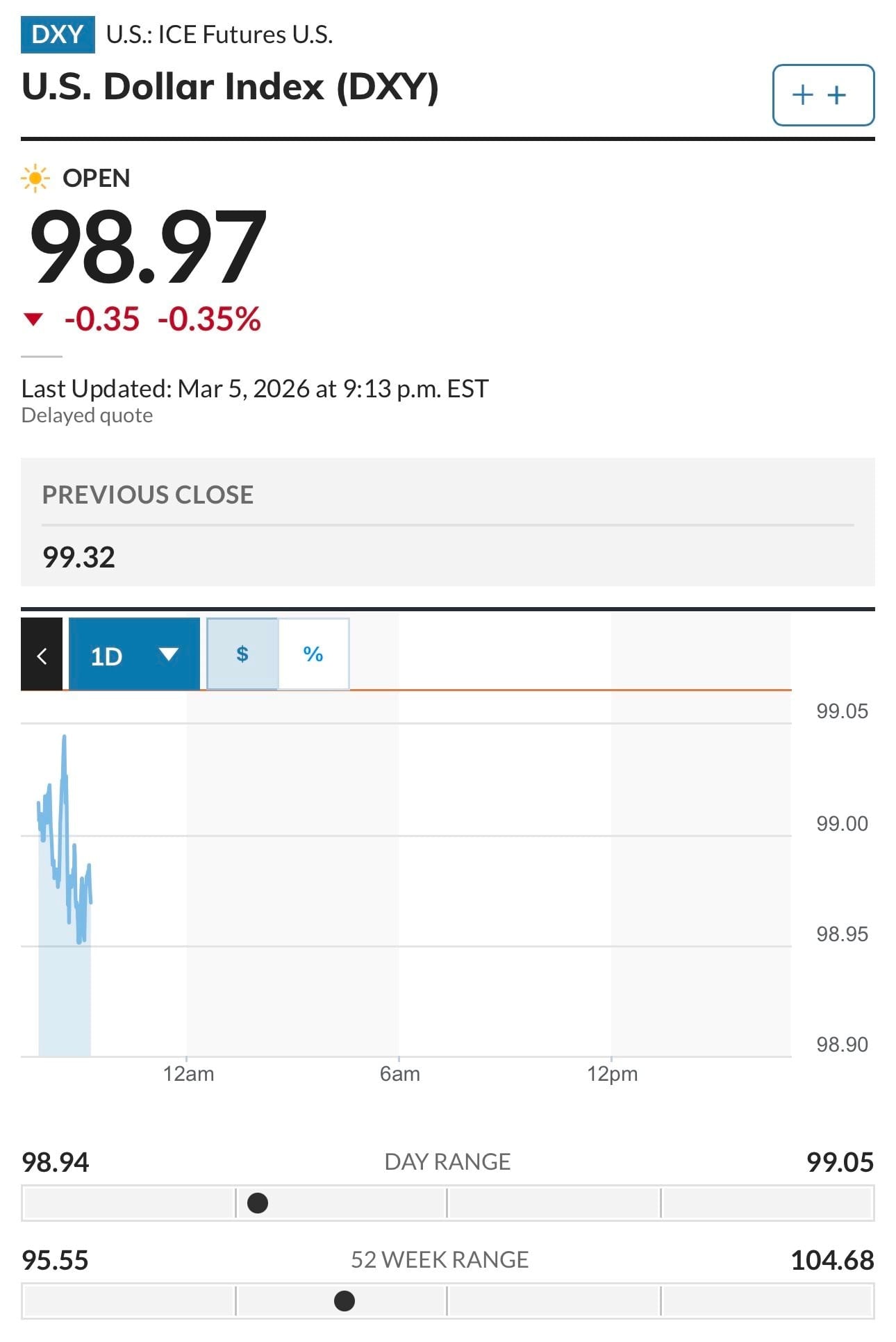 Chỉ số DXY dao động ổn định quanh mức 99 điểm và dự kiến sẽ tăng hơn 1% trong tuần này, được hỗ trợ bởi nhu cầu trú ẩn an toàn khi xung đột leo thang ở Trung Đông và giá dầu tăng cao làm bất ổn thị trường tài chính