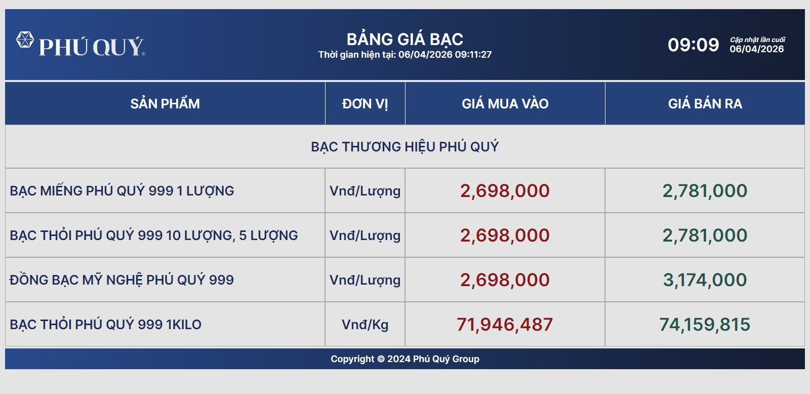 margin: 15px auto;" />Cụ thể, khảo sát lúc 9h09, bạc miếng Phú Quý 1 lượng mua vào - bán ra là 2,698- 2,781 triệu đồng/lượng; bạc thỏi Phú Quý mua vào - bán ra là 71,946 - 74,159 triệu đồng/kg. Như vậy, trong vòng 1 tháng qua, giá bạc giảm gần 15%, tuy nhiên trong vòng 1 năm qua, giá bạc tăng hơn 128%.