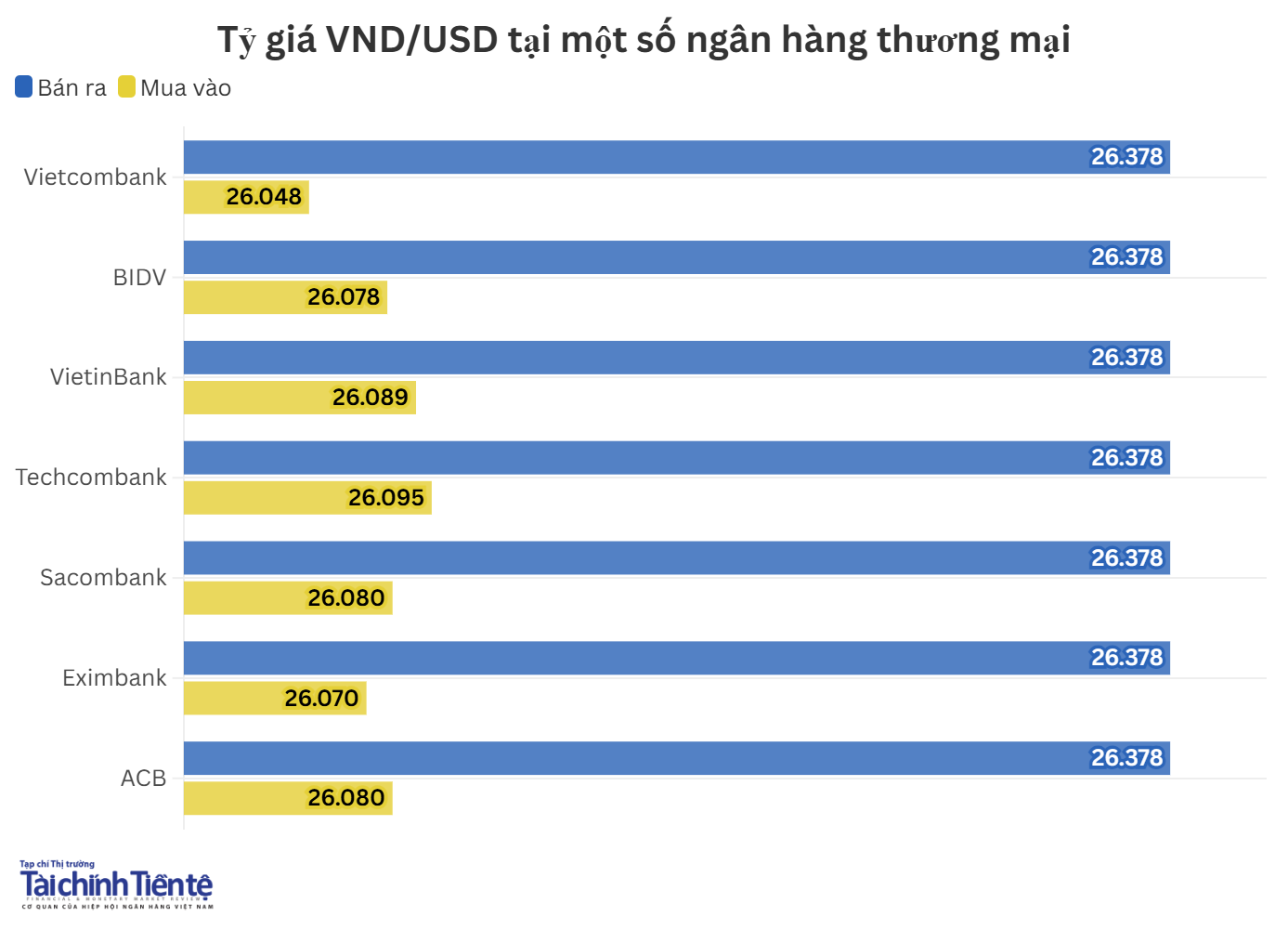 Hiện, giá mua thấp nhất ở mức 26.048 VND/USD, giá mua cao nhất ở mức 26.095 VND/USD. Giá bán ra được các ngân hàng đồng loạt niêm yết ở mức 26.378 VND/USD.