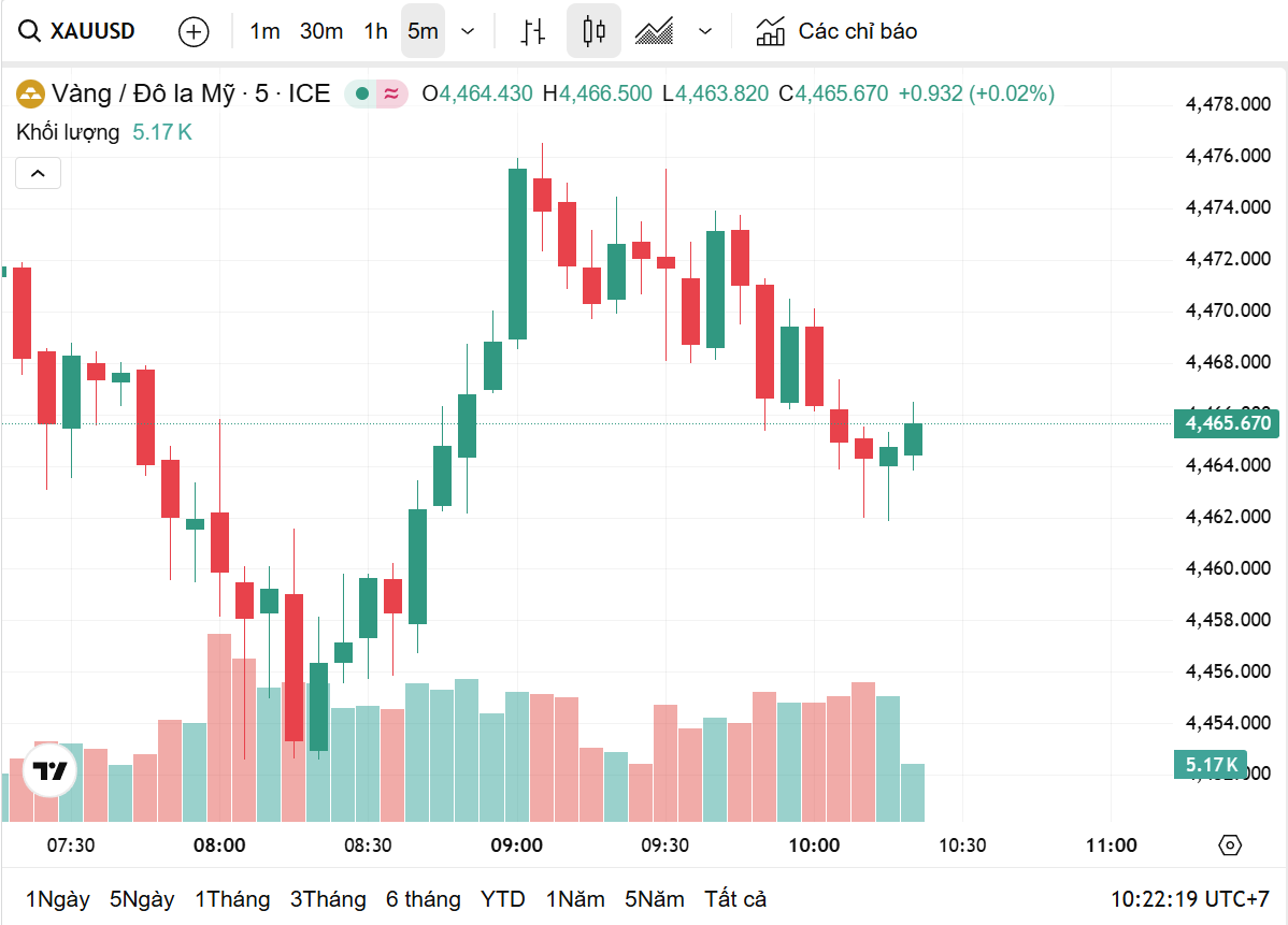 Giá vàng miếng lẫn vàng nhẫn đi lên theo đà tăng của giá thế giới. Thời điểm 9h30' theo giờ Việt Nam, giá vàng thế giới giao ngay ở mức 4.465 USD/ounce, tăng 13,7 USD/ounce so với với đầu phiên sáng. Hiện, giá vàng thế giới quy đổi theo tỷ giá niêm yết tại Vietcombank vào khoảng 142 triệu đồng/lượng.