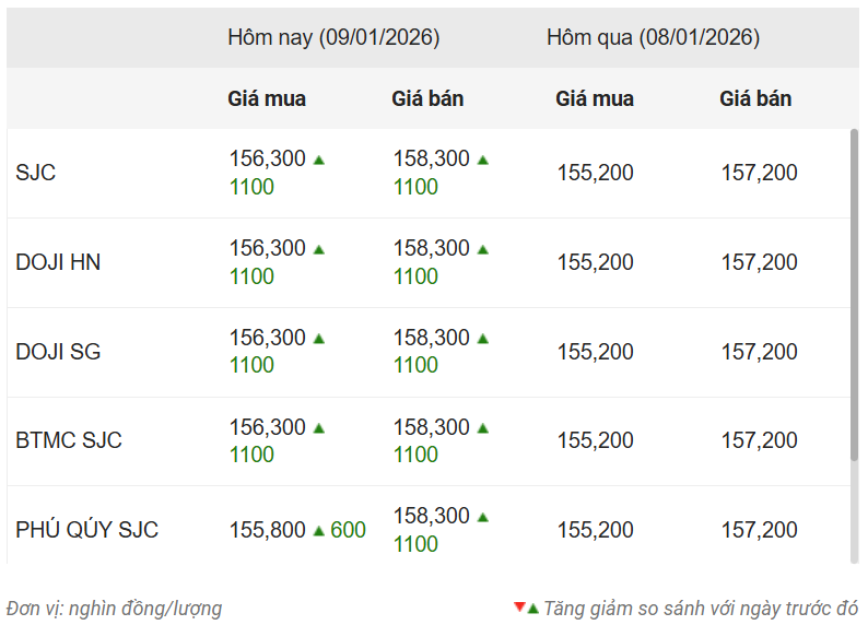 margin: 15px auto;" />Công ty Vàng bạc đá quý Sài Gòn (SJC), Tập đoàn Vàng bạc Đá quý DOJI và Bảo Tín Minh Châu cùng niêm yết giá vàng miếng SJC mua vào-bán ra ở mức 156,3-158,1 triệu đồng/lượng, tăng 1,1 triệu đồng ở cả chiều mua và chiều bán ra so với chốt phiên hôm qua.