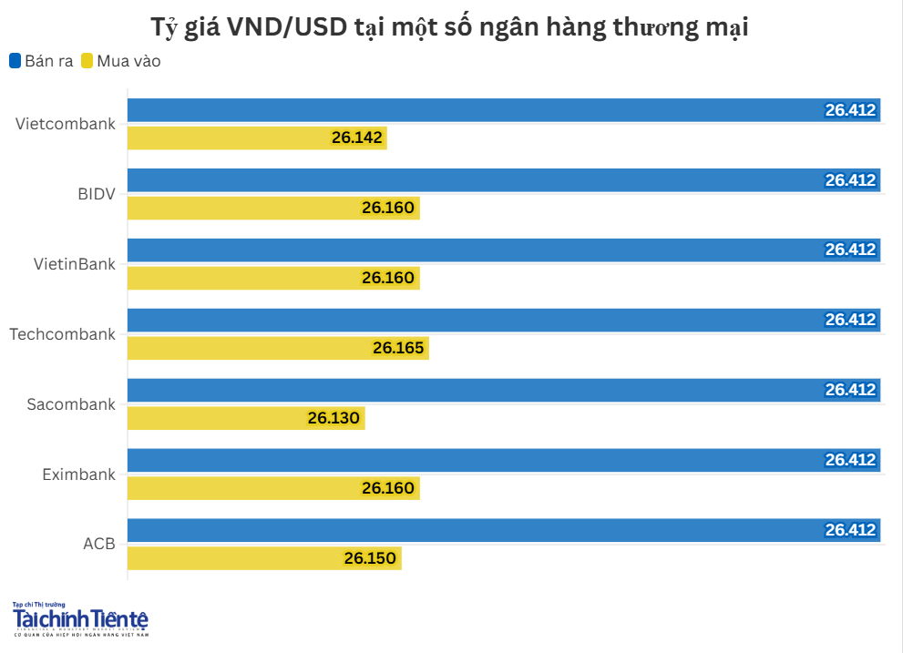 Hiện, giá mua thấp nhất ở mức 26.130 VND/USD, giá mua cao nhất ở mức 26.165 VND/USD. Giá bán ra được các ngân hàng đồng loạt niêm yết ở mức 26.412 VND/USD.