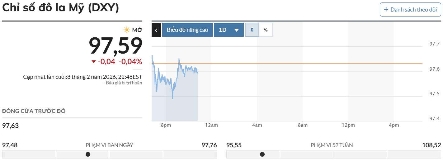 Cùng thời điểm, trên thị trường thế giới, chỉ số USD Index (DXY) - thước đo sức mạnh của đồng bạc xanh so với 6 đồng tiền chủ chốt - ở mức 97,86 điểm, tăng 0,03 điểm so với phiên giao dịch trước.