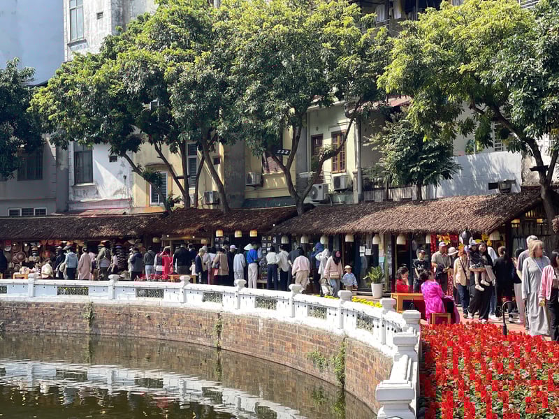 Không gian Hồ Văn năm nay được bài trí hài hòa giữa yếu tố truyền thống và hơi thở đương đại. Các khu trưng bày tranh, trải nghiệm di sản, làng nghề thủ công, không gian xin chữ đầu năm và khu giới thiệu ẩm thực Hà Nội tạo nên một tổng thể sinh động. Ảnh: Mai Linh
