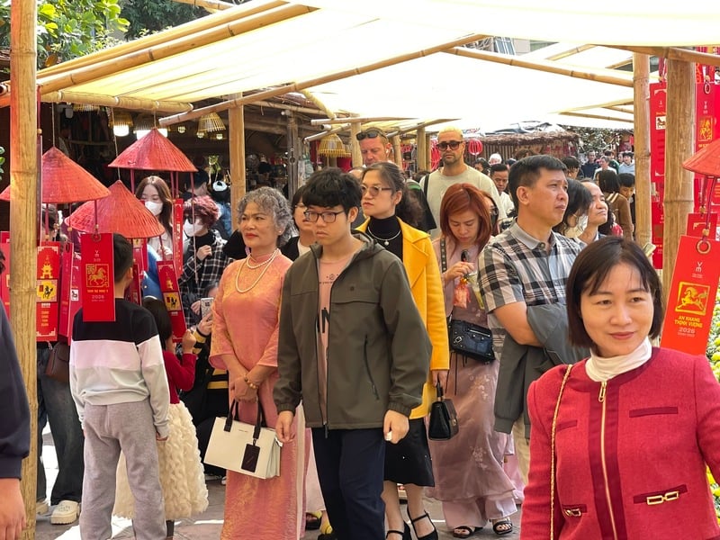 Theo ghi nhận của phóng viên Báo Công Thương, tiết trời mùa xuân năm nay dịu nhẹ, se se lạnh, đôi lúc có nắng ấm, thuận lợi cho việc tham quan. Nhờ đó, hàng vạn du khách và người dân nườm nượp đổ về Văn Miếu Quốc Tử Giám du xuân, thưởng lãm.