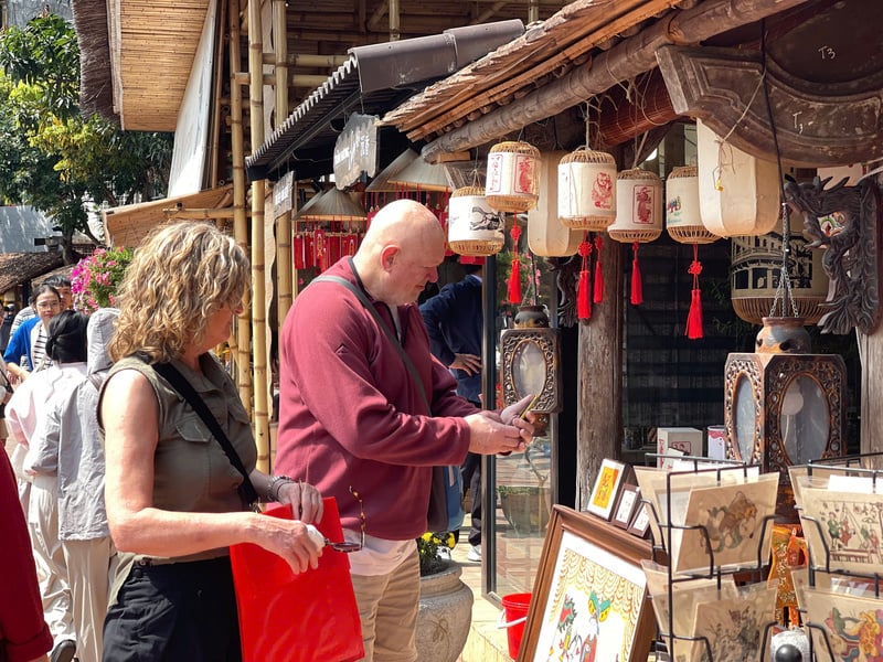Nhiều du khách nước ngoài bày tỏ niềm phấn khích, hứng thú với những tác phẩm nghệ thuật truyền thống của Việt Nam. Ảnh: Mai Linh