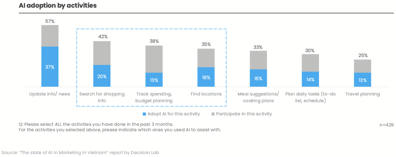 Nghiên cứu của Decision Lab cũng ghi nhận mức độ ứng dụng AI ngày càng cao trong hành trình mua sắm. Trong đó, 20% dùng AI để tìm thông tin mua sắm, 18% dùng để tìm địa điểm, phản ánh sự tin cậy ngày càng lớn vào AI như công cụ tìm kiếm thông tin theo thời gian thực.