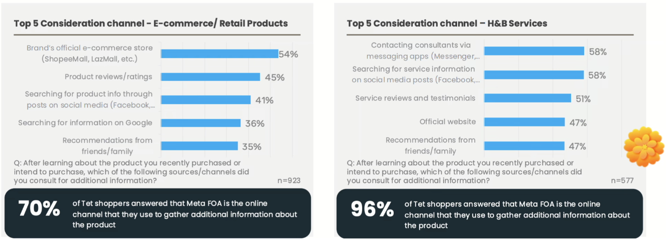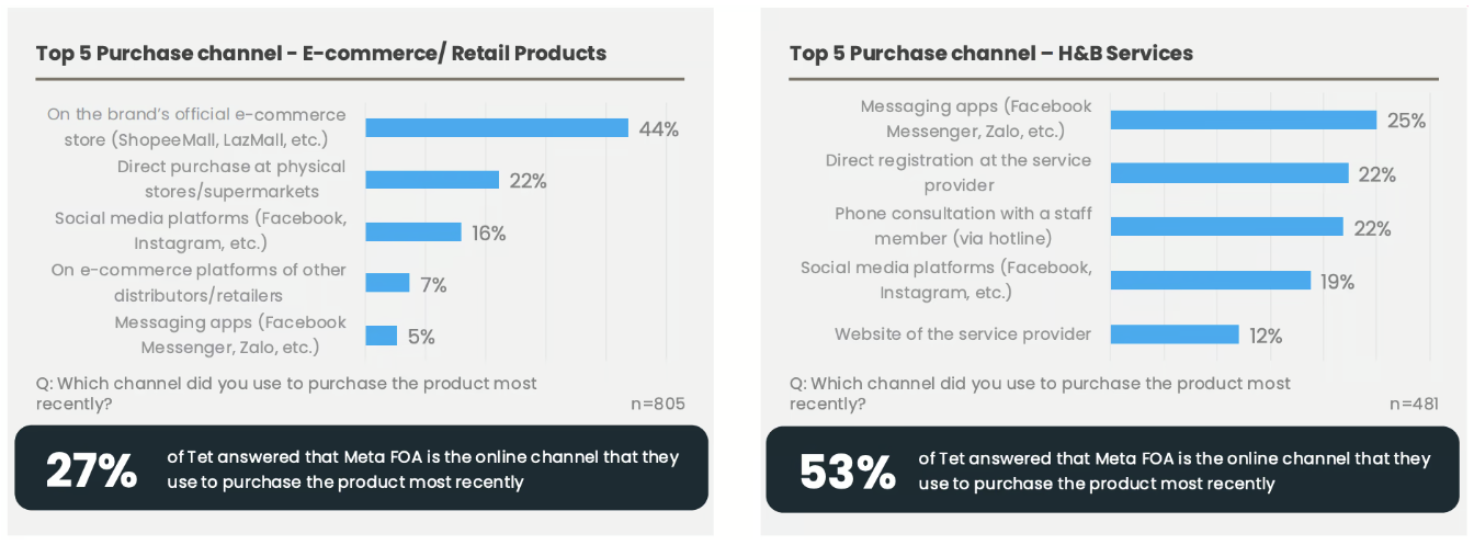 Trong nhóm người mua sắm Tết, 27% cho biết hệ sinh thái ứng dụng Meta (Facebook, Instagram, Messenger, WhatsApp) là kênh duy nhất họ sử dụng trong lần gần nhất mua sản phẩm bán lẻ. Với nhóm H&B, con số này tăng lên 53%.