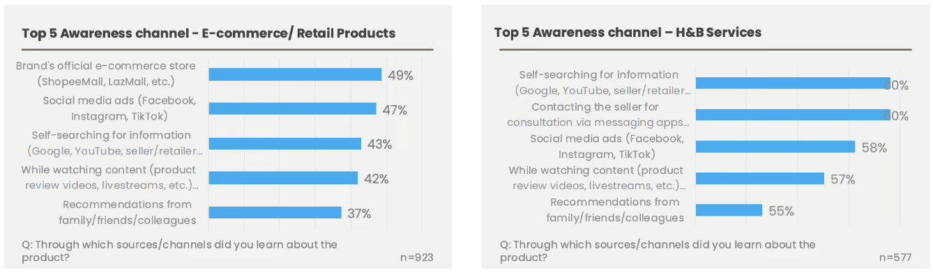 Đối với nhóm sản phẩm bán lẻ nói riêng, mạng xã hội và sàn thương mại điện tử là nguồn chính để người tiêu dùng nhận biết, nghiên cứu và mua sản phẩm. Đáng chú ý, trang chính thức của thương hiệu trên ShopeeMall hoặc LazMall là kênh được sử dụng nhiều nhất để khám phá sản phẩm (49%), tìm hiểu thông tin (54%) và hoàn tất giao dịch (44%).