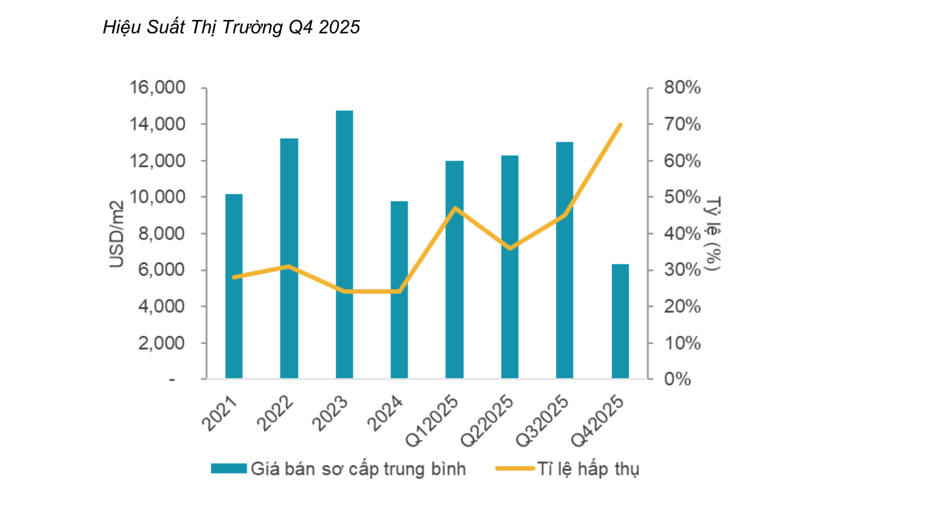 Mặc dù giá bán sơ cấp trung bình thấp đáng kể, thị trường vẫn ghi nhận sức hút cực lớn với tỷ lệ hấp thụ ấn tượng 70% nhờ vào nhu cầu tích sản tại các khu đô thị có quy hoạch bài bản.