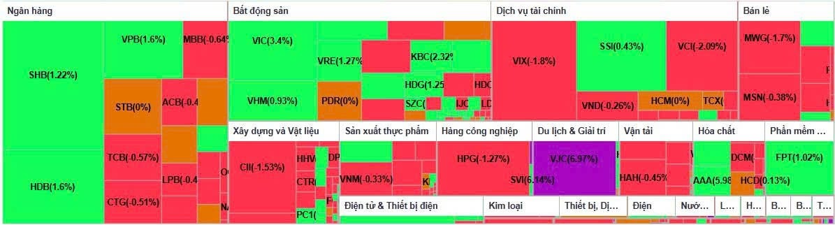 Nhóm ngân hàng giao dịch giằng co nhưng vẫn có những điểm sáng. SHB dẫn đầu thanh khoản toàn thị trường với hơn 83 triệu cổ phiếu – một con số đột biến. Kết phiên, SHB tăng nhẹ 1,2%. Các cổ phiếu khác như HDB và VPB cũng tăng 1,6% và ghi nhận thanh khoản cao, cho thấy dòng tiền vẫn tìm kiếm cơ hội tại các mã ngân hàng có động lực riêng.