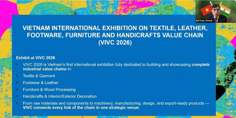 Thực hiện chỉ đạo của Bộ Công Thương về đẩy mạnh tuyên truyền, quảng bá, mời gọi đối tác nước ngoài tham gia Hội chợ Mùa Xuân để doanh nghiệp quốc tế tiếp cận trực tiếp với thị trường và môi trường đầu tư Việt Nam, ngày 14/1/2026, Thương vụ Việt Nam tại Ấn Độ phối hợp với Hiệp hội Dệt may, da giày, nội thất Việt Nam và Ấn Độ tổ chức thành công Hội nghị trực tuyến với chủ đề: “Cơ hội hợp tác Việt Nam - Ấn Độ trong lĩnh vực dệt may, da giày, nội thất tại Hội chợ Mùa Xuân 2026”.