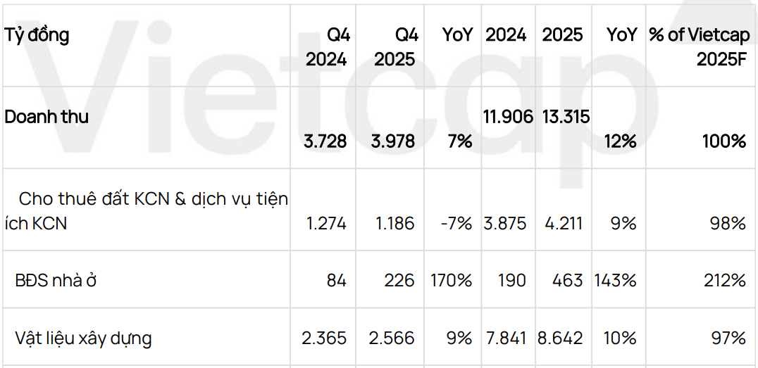 Xét về cơ cấu doanh thu, mảng vật liệu xây dựng tiếp tục đóng vai trò trụ cột khi mang về hơn 8.600 tỷ đồng trong năm 2025, tăng 10% so với năm trước. Doanh thu từ cho thuê đất khu công nghiệp và dịch vụ tiện ích cũng tăng nhẹ, dù diện tích bàn giao giảm, nhờ mức giá cho thuê bình quân cao hơn. Ngược lại, hiệu quả sinh lời của một số mảng, đặc biệt là kính xây dựng, vẫn là điểm cần theo dõi trong bối cảnh biên lợi nhuận chưa cho thấy sự phục hồi rõ rệt.