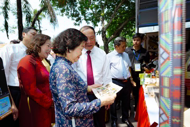 Bộ trưởng Bộ Văn hóa, Thể Thao và Du lịch Nguyễn Văn Hùng (thứ 2 từ trái qua), nguyên Phó Chủ tịch nước Trương Mỹ Hoa, cùng các đại biểu tham quan gian hàng trong ngày hội. Ảnh: Minh Khuê.