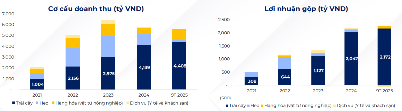 Các số liệu mới nhất cho thấy mảng trái cây chiếm gần 80% doanh thu và đóng góp 98% lợi nhuận gộp của doanh nghiệp. Biên lợi nhuận gộp hợp nhất đạt khoảng 49%, cải thiện đáng kể so với mức 38% của năm 2023. Tỷ trọng này phản ánh đúng xu hướng HAG đang dịch chuyển sang nhóm sản phẩm có giá trị cao, biên lợi nhuận ổn định và khả năng tiêu thụ quốc tế.