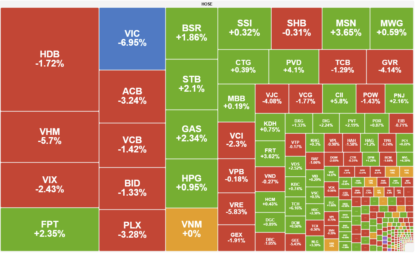 Kết thúc phiên giao dịch hôm nay, sàn HOSE có 140 mã tăng và 172 mã giảm, VN-Index giảm 27,59 điểm (-1,51%), xuống 1.802,91 điểm. Tổng khối lượng giao dịch đạt hơn 1,04 tỷ đơn vị, giá trị đạt 34.585,4 tỷ đồng, tăng hơn 30% về khối lượng và 35% về giá trị so với phiên hôm qua. Giao dịch thỏa thuận đóng góp hơn 183,4 triệu đơn vị, giá trị đạt 5.498 tỷ đồng.