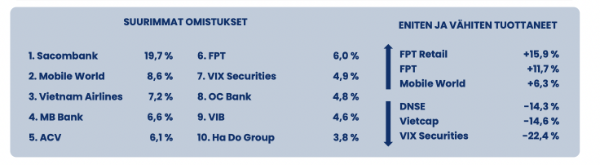 Tuy nhiên, sau giai đoạn tăng nóng, thị trường nhanh chóng chịu áp lực chốt lời, khiến chỉ số lùi 1,33% so với tháng trước và tác động tiêu cực đến các cổ phiếu tài chính mà quỹ nắm giữ.