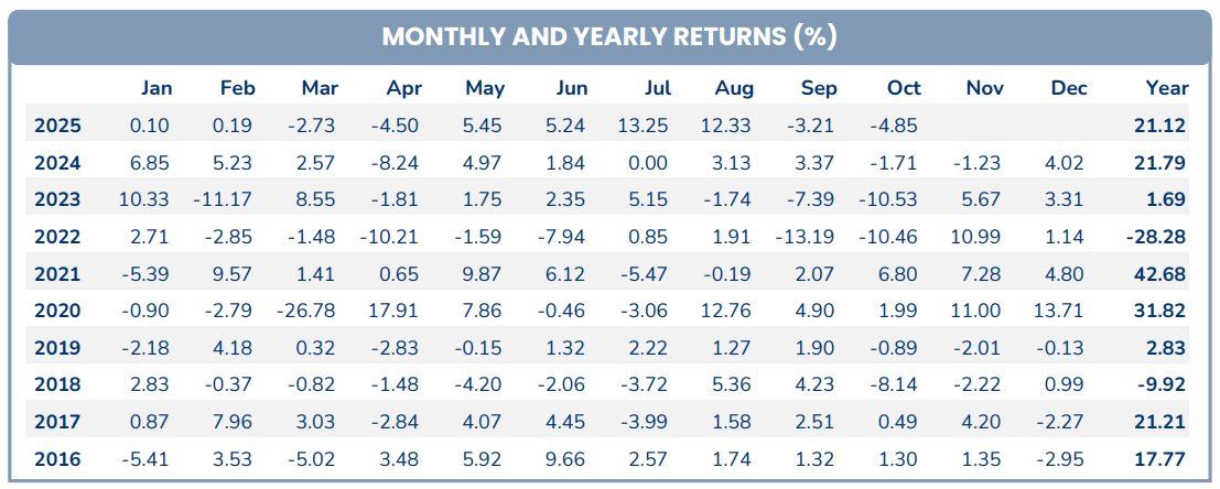 Đáng chú ý, FPT đã trở lại top 6 danh mục với tỷ trọng 6%, sau khi vắng mặt trong báo cáo tháng 9. Nhóm “họ FPT” có diễn biến nổi bật khi FRT tăng gần 16% và FPT tăng hơn 12% trong tháng 10, đóng góp tích cực cho hiệu suất chung.
