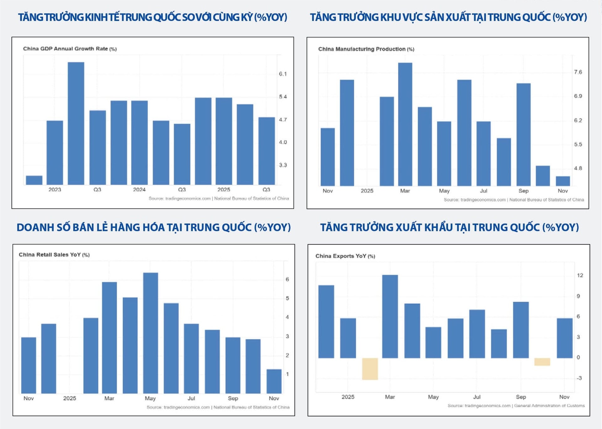 Tốc độ tăng trưởng GDP của Trung Quốc trong năm 2025 đạt mục tiêu đề ra (tăng 5%). Đà tăng trưởng được duy trì nhờ diễn biến tích cực của hoạt động sản xuất công nghiệp và xuất khẩu tăng trưởng ổn định, mở rộng sang nhiều thị trường mới. Tuy nhiên, tiêu dùng nội địa yếu, niềm tin người tiêu dùng suy giảm và thị trường bất động sản vẫn chưa có khởi sắc.