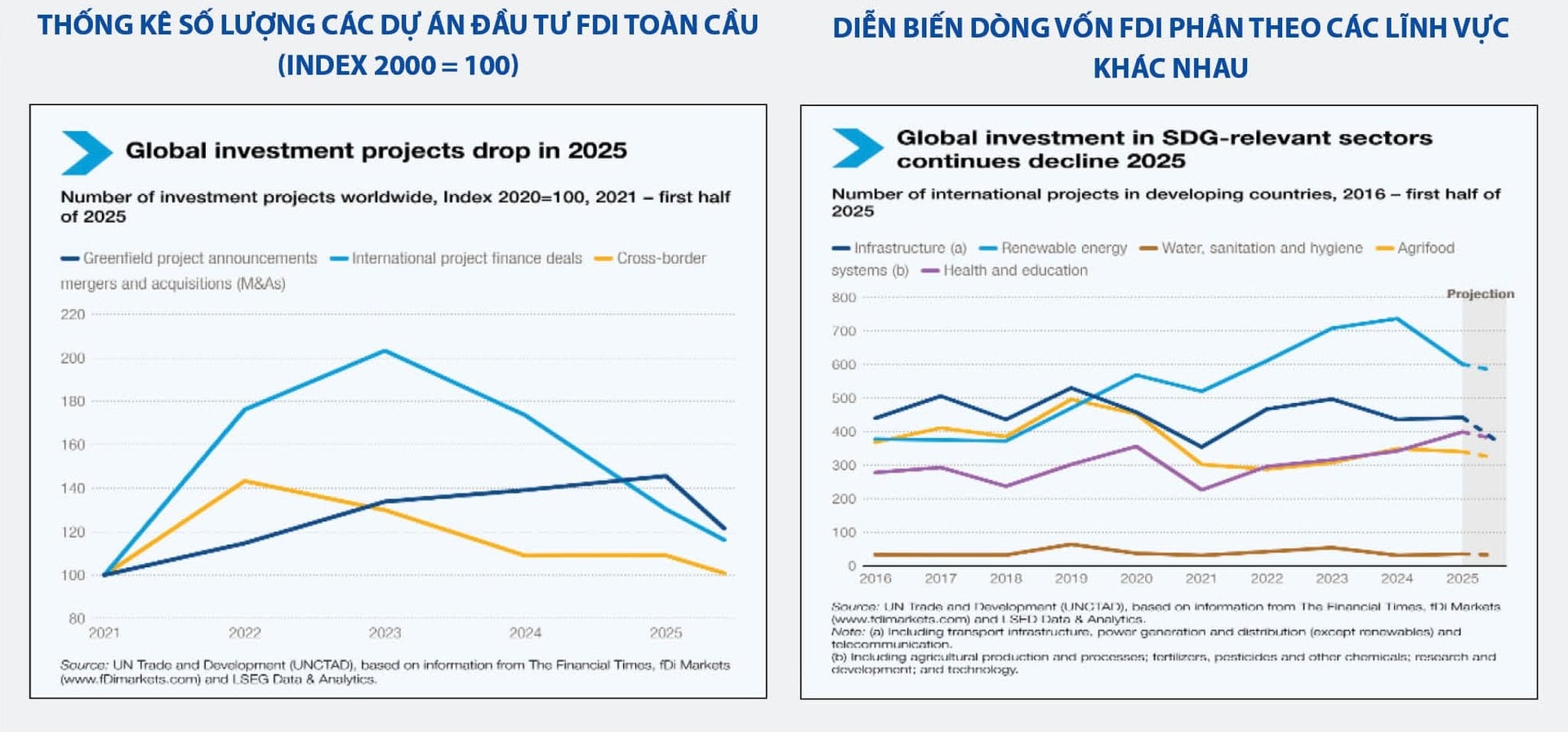 Theo báo cáo của UNCTAD, trong 6 tháng đầu năm 2025, số lượng các dự án FDI toàn cầu ghi nhận mức sụt giảm khoảng 3% so với cùng kỳ năm 2024. Các lĩnh vực chịu ảnh hưởng nặng nhất là cơ sở hạ tầng, sản xuất và các dự án dài hạn. Châu Âu là nơi ghi nhận mức đầu tư giảm mạnh nhất do lãi suất cao và suy yếu đầu tư nội khối, trong khi Bắc Mỹ duy trì mức FDI tương đối ổn định nhưng tăng trưởng thấp. Khu vực châu Á tiếp tục là điểm đến FDI lớn nhất thế giới, đặc biệt tại Ấn Độ, ASEAN và Trung Quốc. Tuy nhiên, nhiều nền kinh tế đang phát triển tại châu Á, bao gồm ASEAN, cũng chịu ảnh hưởng từ nhu cầu toàn cầu yếu và chi phí tài chính cao.