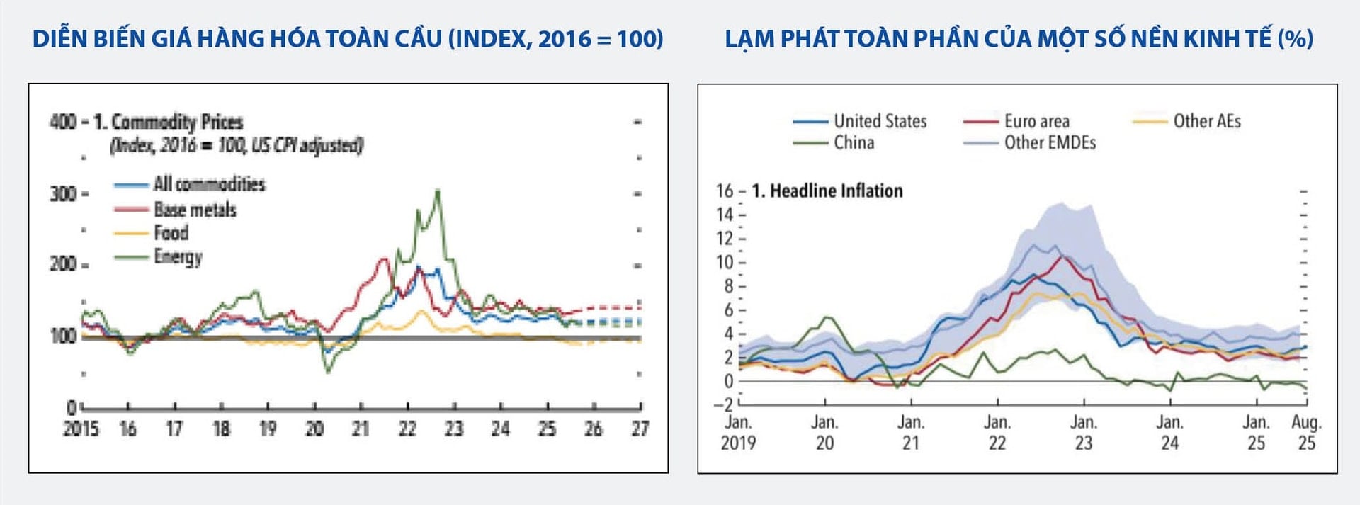 Trong báo cáo triển vọng kinh tế toàn cầu xuất bản vào tháng 10/2025, IMF đã nhận định lạm phát toàn cầu năm 2025 dự kiến sẽ đạt mức tăng khoảng 4,3%, thấp hơn mức lạm phát trên 5% của năm 2024. Nhìn chung áp lực lạm phát năm 2025 thấp do giá cả hàng hóa toàn cầu tiếp tục xu hướng giảm diễn ra từ năm ngoái, với mức giảm năm 2025 theo ước tính của WB là khoảng 7%. Đáng chú ý, giá dầu đã giảm mạnh khoảng 20%, giá dầu Brent đã giảm mạnh từ vùng 75,93 USD/thùng đầu năm lùi về quanh 60,9 USD/thùng vào cuối năm, trong khi dầu WTI giảm xuống gần 57 USD/thùng. Xu hướng giảm giá này xuất phát từ nguồn cung dồi dào trên diện rộng, trong khi tăng trưởng kinh tế toàn cầu vẫn ở mức khiêm tốn khiến nhu cầu đối với các loại hàng hóa và năng lượng ở mức thấp.
