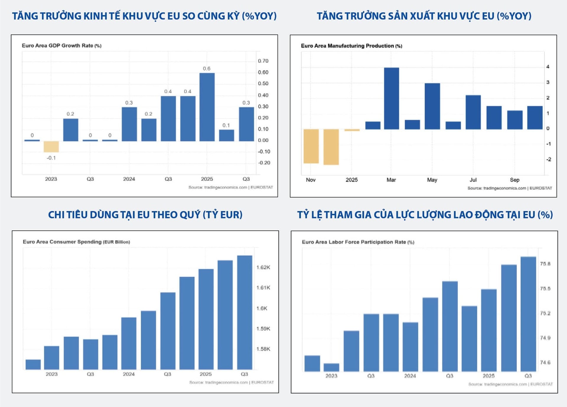 margin: 15px auto;" />Khu vực đồng Euro được dự báo vẫn tăng trưởng chậm trong năm 2025, đạt mức 0,9 – 1,2%. Tiêu dùng hộ gia đình và chi tiêu chính phủ ổn định, cùng với sự phục hồi của hoạt động kinh doanh là những động lực chính hỗ trợ cho đà tăng trưởng trong khu vực. Số lượng việc làm tiếp tục tăng, dù tốc độ chậm lại ở một số nước. Mặc dù vậy, khu vực EU cũng chịu tác động lớn từ chính sách đối ngoại của Mỹ, thách thức từ biến động thương mại toàn cầu, nghĩa vụ tăng chi tiêu quốc phòng và đối phó với những áp lực từ cuộc chiến Nga – Ukraine kéo dài. Đây đều là những nhân tố quan trọng, cản trở tăng trưởng EU trong năm vừa qua.