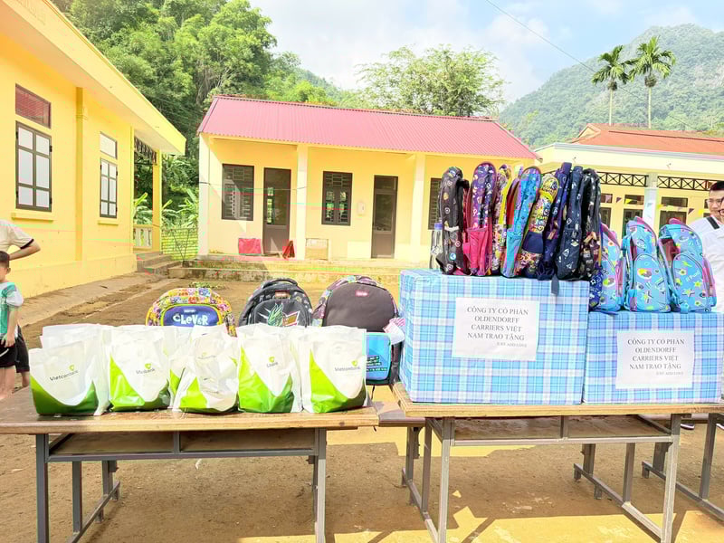 Tặng đồ dùng học tập cho các em học sinh.