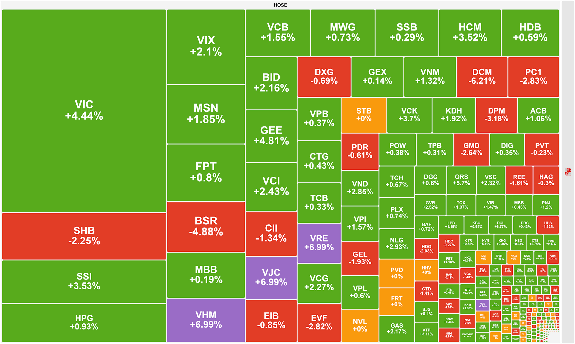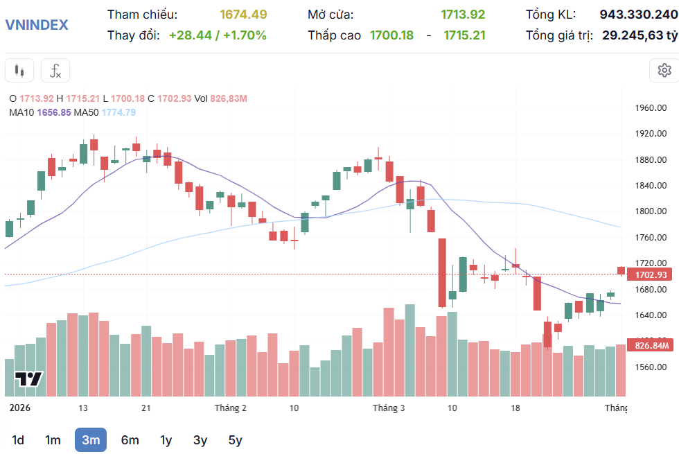 Kết thúc phiên giao dịch hôm nay, VN-Index tăng 28,44 điểm (+1,70%) lên 1.702,93 điểm, với 208 mã tăng và 103 mã giảm. Tổng khối lượng giao dịch đạt 943,3 triệu đơn vị, giá trị đạt 29.245,6 tỷ đồng, tương đương về khối lượng, nhưng tăng hơn 20% về giá trị so với phiên hôm qua - cho thấy dòng tiền hôm nay hướng nhiều hơn tới nhóm cổ phiếu bluechips. Trong đó, giao dịch thỏa thuận đóng góp 7,1 triệu đơn vị, giá trị đạt 116,5 tỷ đồng.