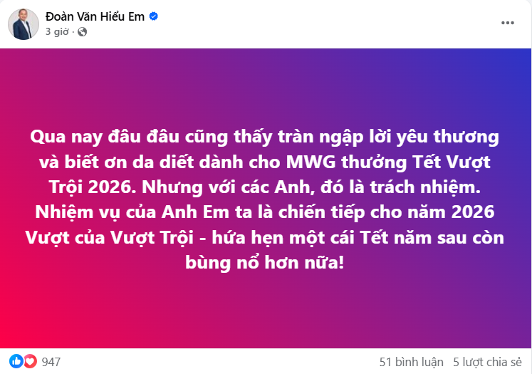 margin: 15px auto;" />Theo ông Hiểu Em, trong những ngày này đâu đâu cũng thấy tràn ngập lời yêu thương và biết ơn da diết dành cho MWG thưởng Tết Vượt Trội 2026. Dù vậy, vị lãnh đạo của MWG cho rằng điều này là bình thường và đó là trách nhiệm của những người lãnh đạo như ông.