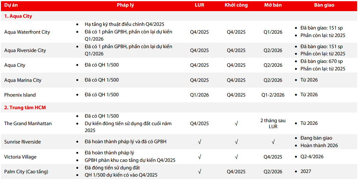 Tại TP.HCM, loạt dự án trung tâm cũng đang trở lại đường đua sau thời gian dài chờ đợi. The Grand Manhattan dự kiến hoàn tất nghĩa vụ tài chính vào cuối 2025 trước khi bước vào giai đoạn mở bán và bàn giao từ 2026. Sunrise Riverside gần như đã hoàn tất pháp lý và đang tiến hành bàn giao. Victoria Village cũng tiến gần thời điểm mở bán, còn Palm City vốn được đánh giá có biên lợi nhuận tốt đang chuẩn bị hoàn tất quy hoạch 1/500 để kịp khởi công trong quý IV/2025. Tổng cộng hơn 8.400 sản phẩm từ nhóm dự án TP.HCM sẽ được bàn giao trong sáu năm, đóng góp quan trọng vào sự trở lại của phân khúc cao tầng vốn từng là thế mạnh của NVL.
