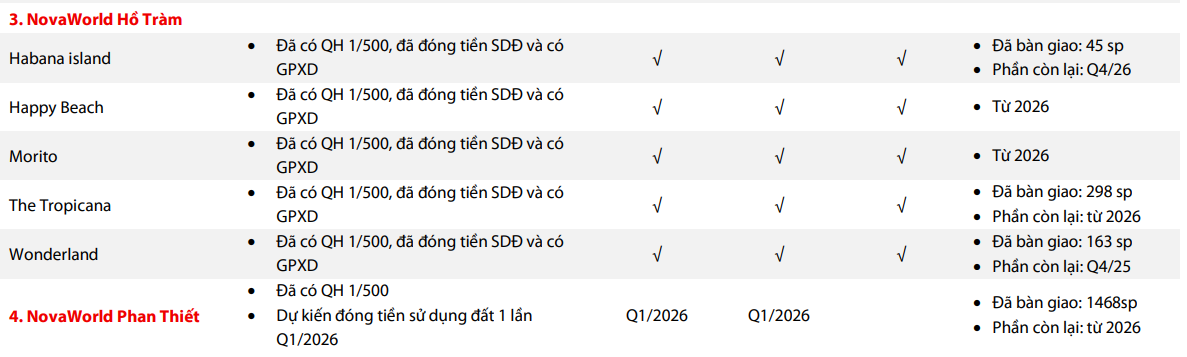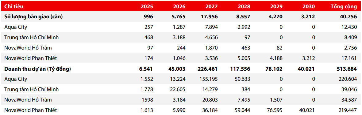 Đáng chú ý nhất là NovaWorld Phan Thiết, đây là dự án có quy mô và sức ảnh hưởng lớn nhất trong danh mục khi đã bàn giao 1.468 sản phẩm và đang chuẩn bị bước vào giai đoạn tăng tốc sau khi hoàn tất nghĩa vụ tài chính dự kiến trong quý I/2026. Tổng cộng hơn 17.161 sản phẩm sẽ được bàn giao từ 2025–2030, với đỉnh dự kiến rơi vào các năm 2028–2029. Doanh thu dự kiến từ dự án lên tới 219.447 tỷ đồng, chiếm tỷ trọng lớn nhất trong toàn bộ kế hoạch sáu năm.