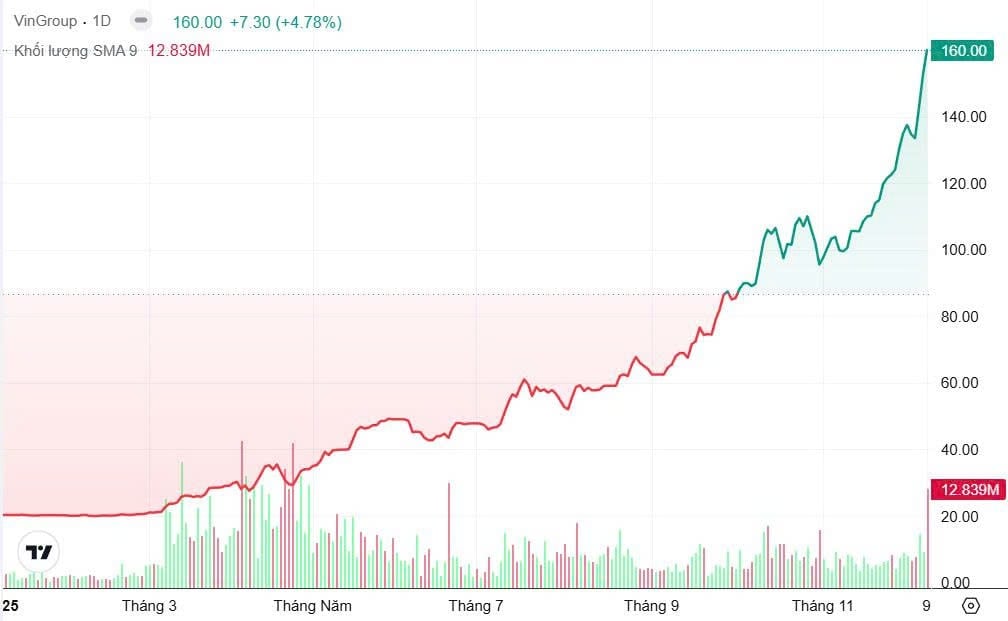 Cùng với đà tăng giá cổ phiếu, vốn hóa thị trường của Vingroup đã vượt mốc 1,2 triệu tỷ đồng, lớn hơn tổng vốn hóa của ba ngân hàng quốc doanh Vietcombank, VietinBank và BIDV cộng lại. Nếu tính từ đầu năm 2025, cổ phiếu VIC đã tăng từ vùng 40.000 đồng lên đỉnh 275.000 đồng/cổ phiếu trước chia thưởng và tiếp tục tăng mạnh sau điều chỉnh.