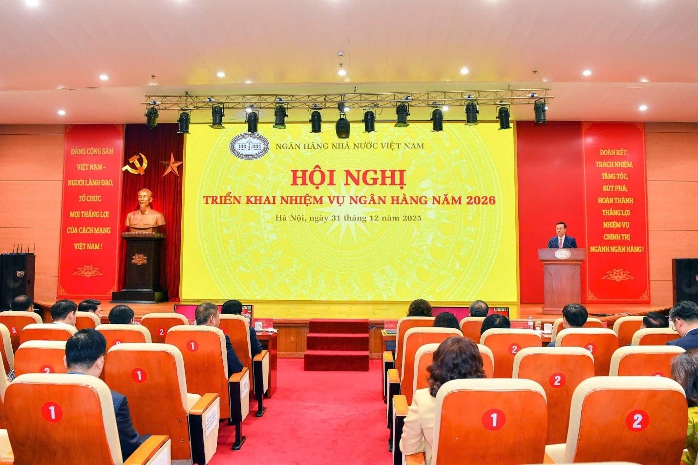 margin: 15px auto;" />Ngày 30/12/2025, Thống đốc NHNN đã ban hành văn bản số 11616/NHNN-TCCB phát động phong trào thi đua hoàn thành xuất sắc nhiệm vụ ngành Ngân hàng năm 2026. Tại Hội nghị triển khai nhiệm vụ ngân hàng năm 2026, thay mặt Ban Thường vụ Đảng ủy, Ban Lãnh đạo NHNN và Hội đồng thi đua khen thưởng ngành Ngân hàng, Phó Thống đốc Phạm Quang Dũng đã phát động phong trào thi đua trong toàn Ngành với chủ đề: “Đổi mới sáng tạo - Số hóa an toàn - Tinh gọn hiệu quả - Quyết tâm hoàn thành xuất sắc nhiệm vụ năm 2026". Các nội dung thi đua gồm: