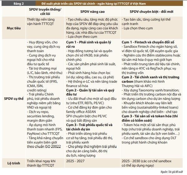 (i) Tập trung - lựa chọn - tạo sự khác biệt; (ii) Phù hợp thông lệ quốc tế kết hợp khai thác tối ưu lợi thế cạnh tranh của địa phương nơi đặt TTTCQT; (iii) Không nhất thiết phát triển theo tuần tự các tầng từ SPDV truyền thống/cốt lõi đến SPDV nâng cao và SPDV chuyên biệt, đổi mới mà có lộ trình phù hợp với mục tiêu, đặc điểm kinh tế - xã hội, mức độ phát triển thị trường tài chính của địa phương nơi đặt TTTCQT hoặc có thể áp dụng ngay thông qua cơ chế sandbox; (iv) Bảo đảm các quy định về phòng, chống rửa tiền, tài trợ khủng bố và an ninh, an toàn tài chính trong TTTCQT nói riêng, hệ thống tài chính quốc gia nói chung. (Bảng 2)